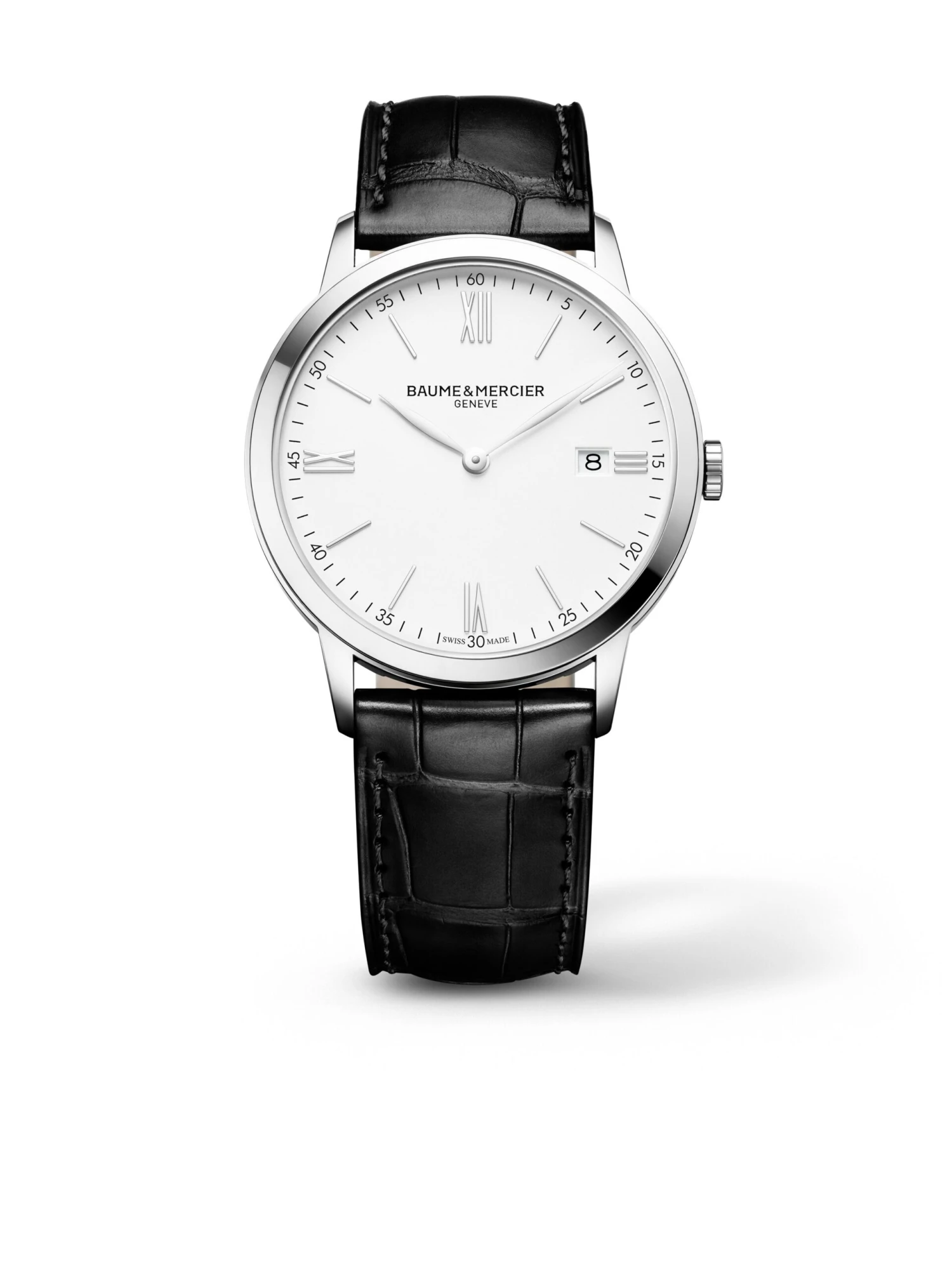 The Classima 10323 is practical yet unobtrusively elegant and is an ideal companion to wear every day. The entry-level model for enthusiasts of mechanical watches is powered by a Swiss quartz ETA movement. The polished stainless steel bezel and the flat stainless steel case measuring 40 x 5.95 millimeters together with the white dial and black calfskin strap are a true classic two-handed watch.