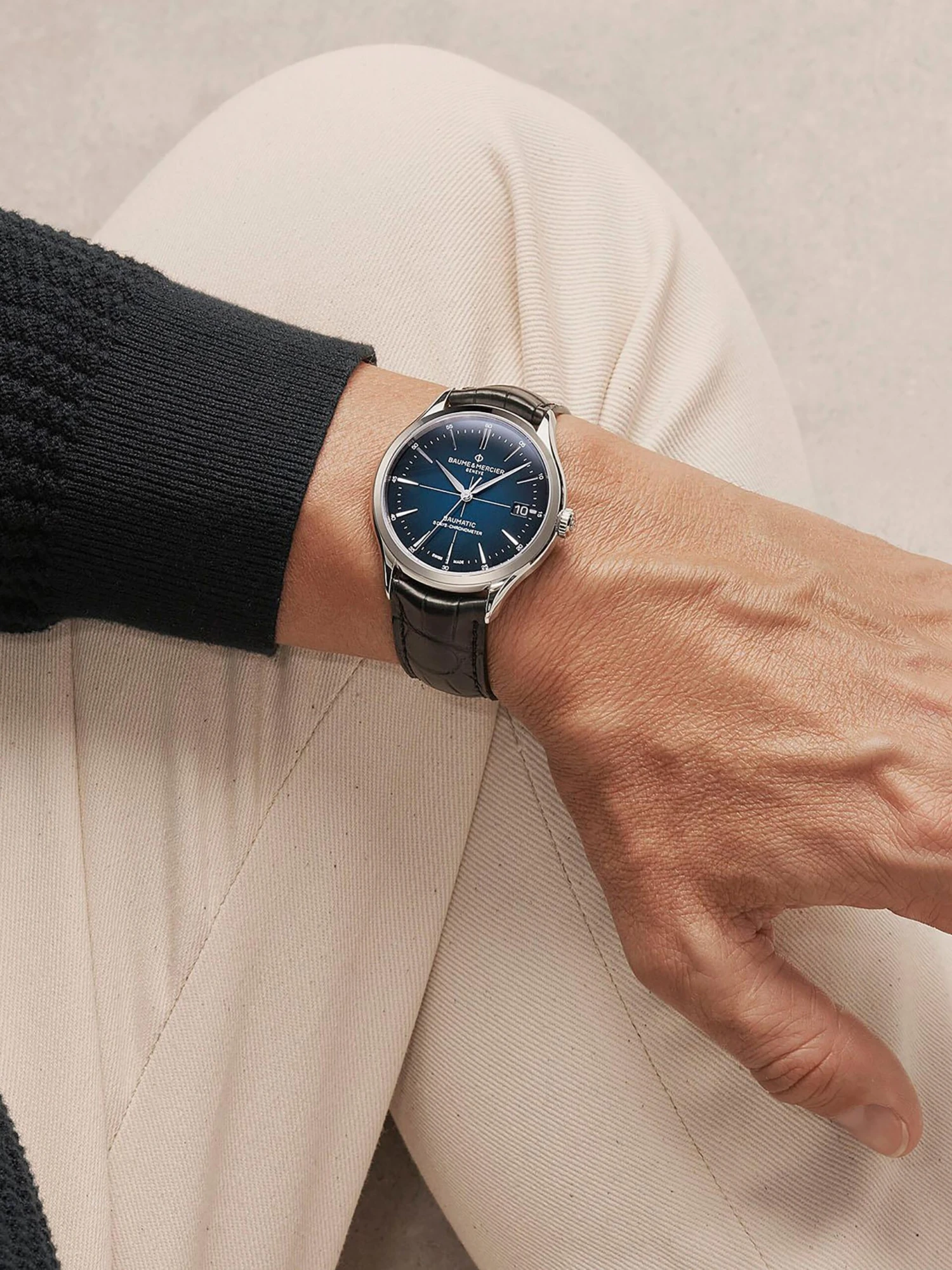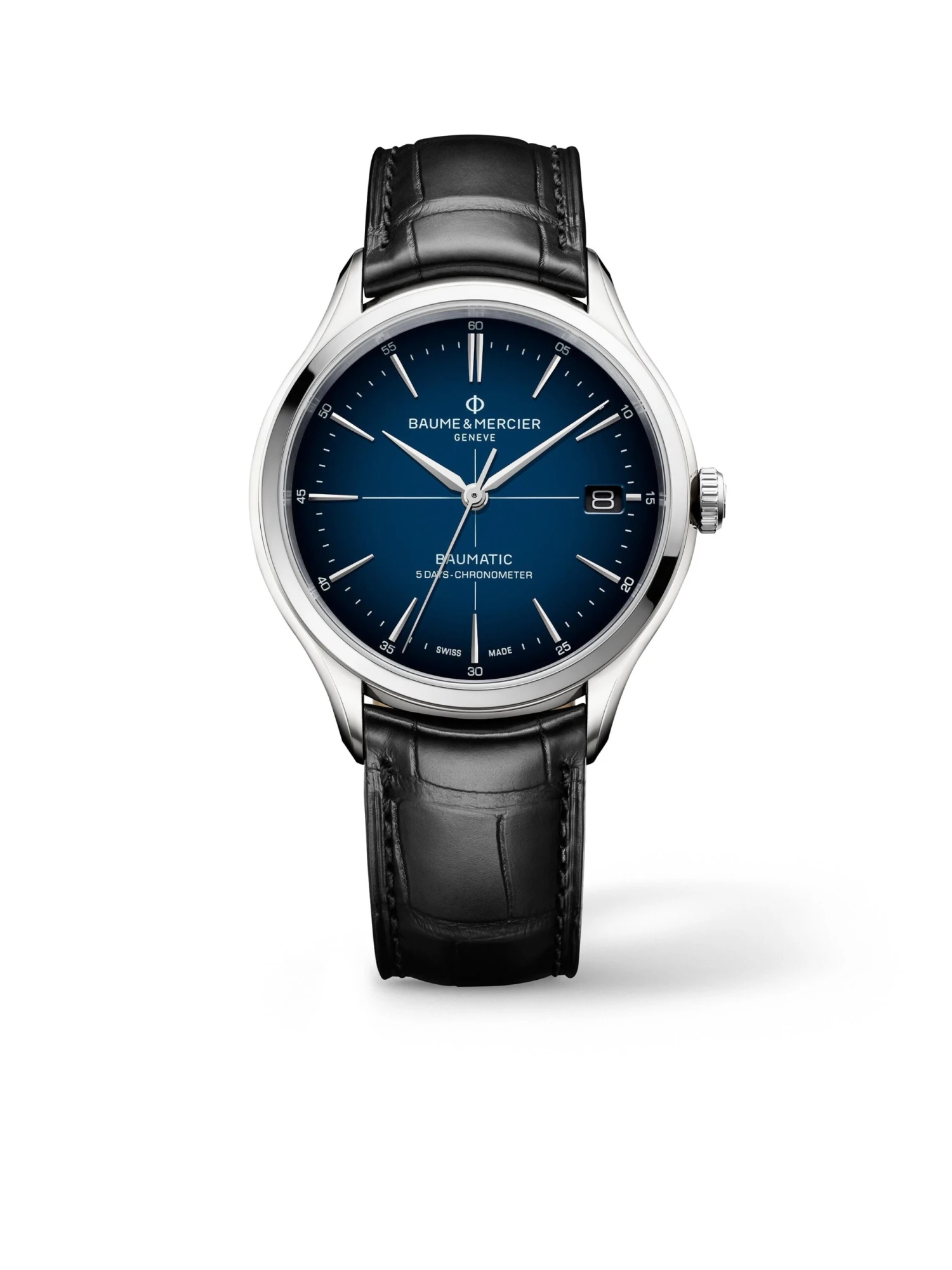With the Clifton Baumatic 10467, Swiss quality is guaranteed by the COSC certificate, which is only bestowed on movements that run with exceptional precision. The automatic movement developed in-house features a power reserve of 120 hours. Externally, the timepiece impresses with its modern and elegant design: Blue dial with rhodium-plated hands and riveted hour markers and a black alligator-skin strap. The stainless steel case measures 40 x 10.3 millimeters.
