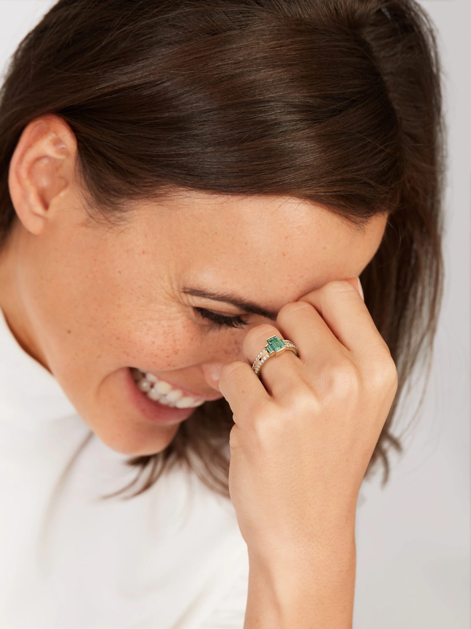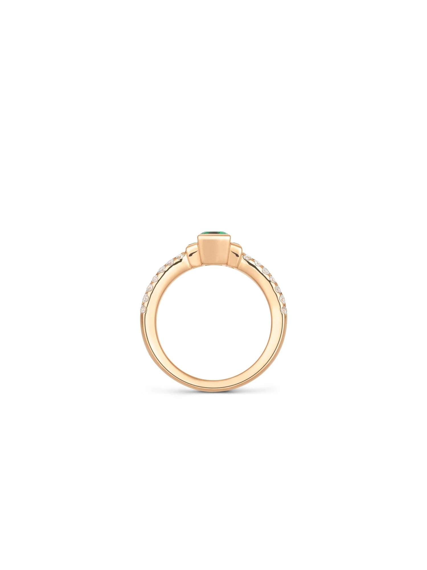 Pastel colors donโt only look tempting, they are also absolutely en vogue in fashion design and provide us with gorgeous outfits. The Colonna light BY KIM ring in 18k rose gold is set in its center with an octagonal-cut green tourmaline, which is flanked on both sides by a column-like tourmaline in a baguette cut. The edge of the ring band is adorned with 28 brilliant-cut diamonds of 0.42 ct in total that give this precious, fresh and contemporary ring additional glamour. It can also be beautifully combined with other rings.
