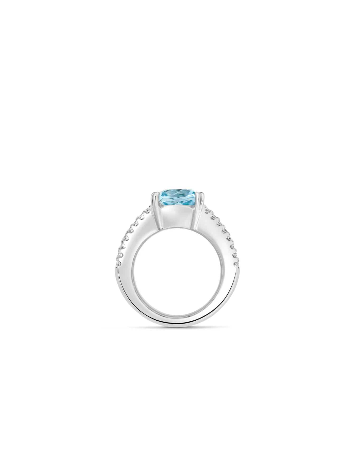 A harmony of colored gemstones: In the Colonna BY KIM ring a blue treated topaz in an antique cut is dominantly enthroned over a double ring band – adorned by 32 brilliant-cut diamonds 0.64 ct in total. Another 11 baguette-cut topazes are arranged between the two bands like the pillars of a temple. In the world of jewelry, this ring is an artisanal coup as it masterfully unlocks the magic of color.