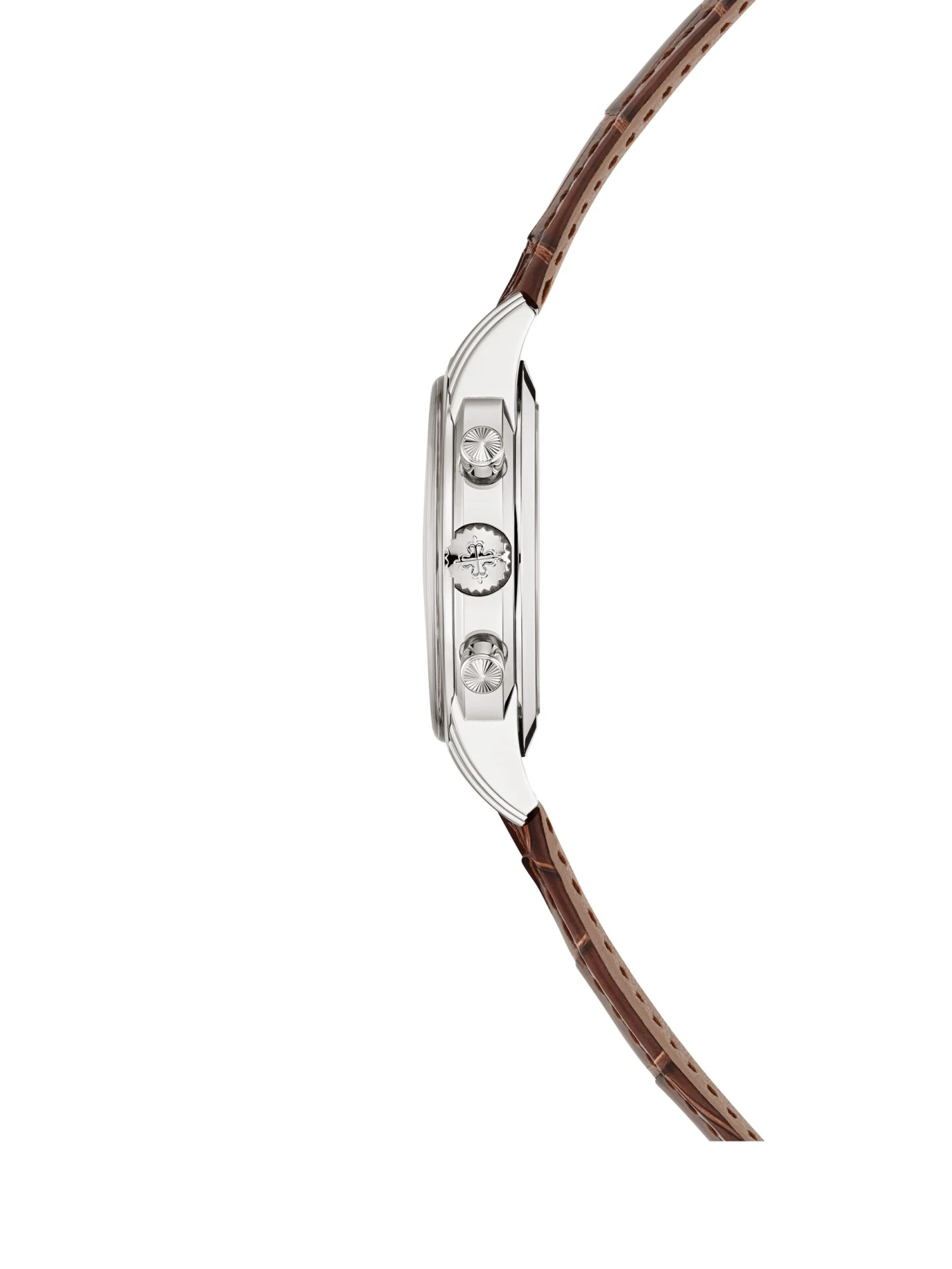 The Ref. 5172G-010 is a classic beauty with its freshly designed 18k white gold case with round, three-tiered, and guilloche push-pieces. The rose gold-colored opaline dial emphasizes the subtle vintage aesthetic. The applied gold numerals and hands are coated with luminous mass and guarantee good readability at day and at night. A small seconds subdial at 9 o’clock complements the dial. This chronograph has very good reasons for being part of the Complications family. The hand-wound caliber CH 29-535 within the 41.0 x 11.45 millimeter case ensures accurate timekeeping with its column-wheel control and instantaneous minute counter. This gem of a mechanism, which is only 5.35 millimeters thick and has a power reserve of 65 hours, comprises 270 components.