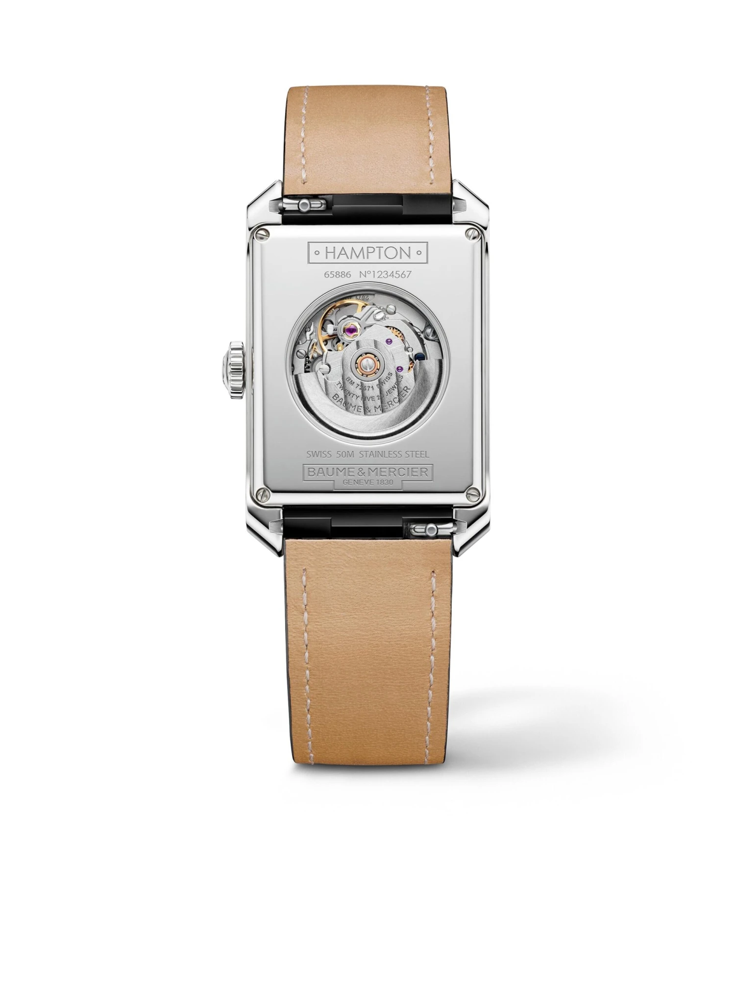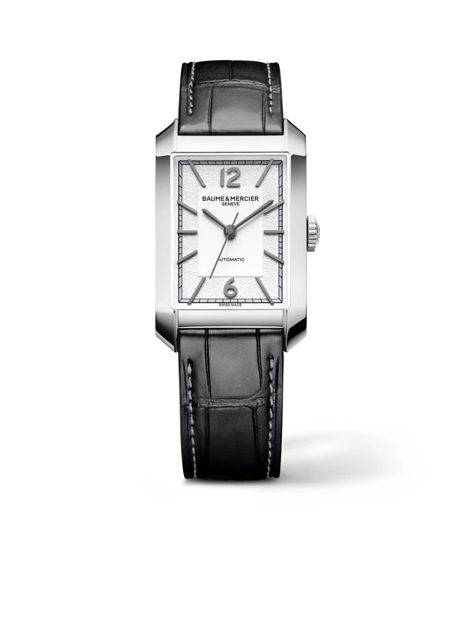 Unique icon with a clear design. The models in the Baume & Mercier Hampton collection continue to be characterized by the unique Art Deco style of the 1920s. The Hampton automatic ref. MOA10522 has a characteristic rectangular stainless steel case with a length of 43 millimeters. The silver-opalized and pearlized dial with black Arabic numerals and markers and ruthenium sword hands is protected behind scratch-resistant sapphire crystal. The three-hand watch with an automatic movement ETA 2671 and a power reserve of 38 hours is water-resistant to 5 bar. The black alligator-skin strap with grey stitching can be replaced independently. An elegant watch that stands out with its linearity.
