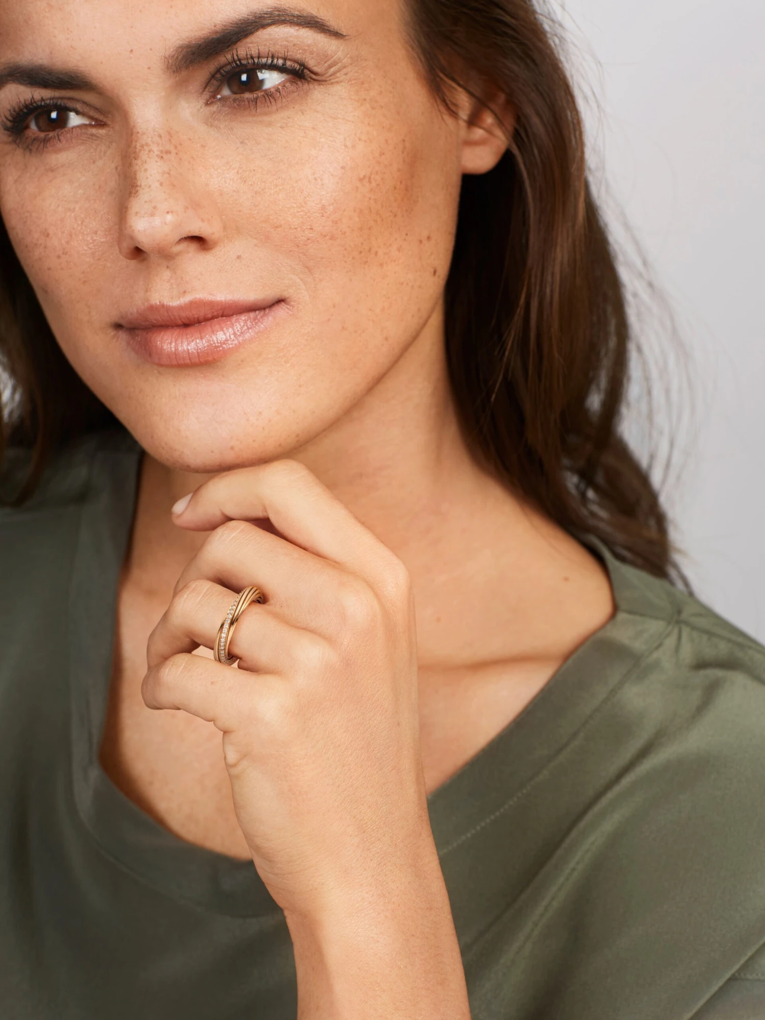 Solidly cast as one piece in 18k rose gold, the Helioro BY KIM ring combines the highest level of goldsmithery and technically demanding processes. The signature of the line is seamlessly intertwined strands that symbolize eternity – without a beginning and an end. A fine line of 45 brilliant-cut diamonds with a total of 0.34 ct provides discreetly sparkling accents on one of the strands.