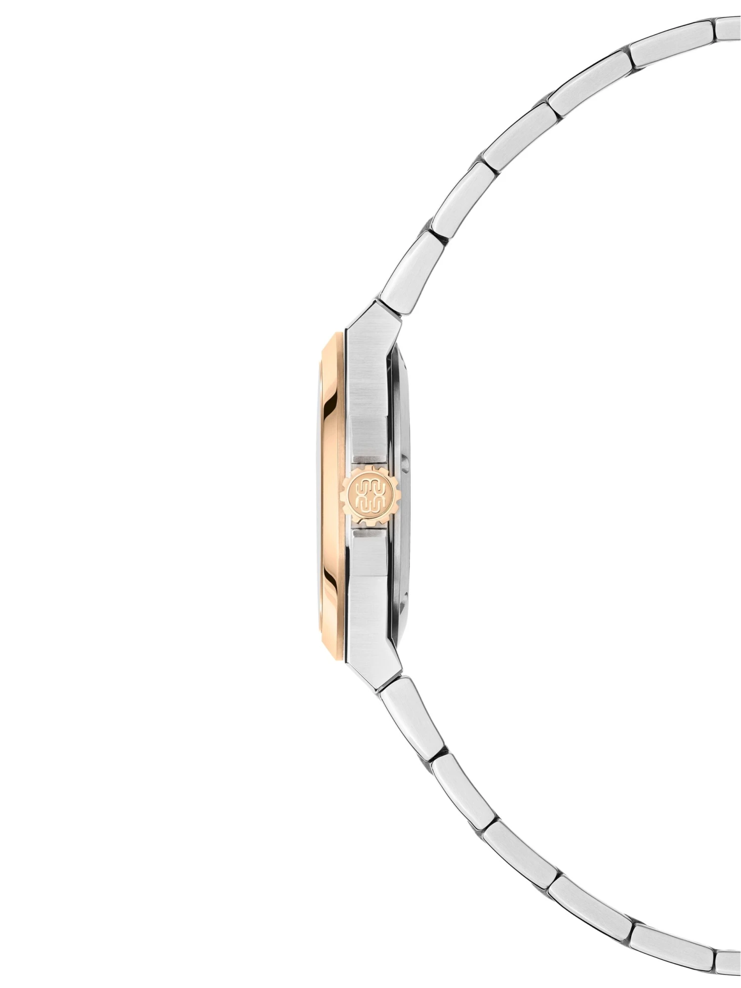 Inspired by the dauntless steel construction workers of the New York skyscrapers from the 1920s, the Wempe Glashütte I/SA Iron Walker Automatic 40 (Ref. WI110004) distinguishes itself by the powerful combination of technical expertise and sparkling elegance. The individualized stainless-steel watch with accents in 18k rose gold offers more than a conventional three-hand watch. The framed date display at 3 o’clock and the striking baton hands with Super-Luminova® coating are delicate details that radiate a certain air of refinement. The 40-millimeter stainless-steel case with a height of only 9.75 millimeters houses a self-winding movement caliber SW300-1a, is water-resistant to 100 meters, and features a dark brown dial with a very clear appearance. A watch that shows elegance and character and fits comfortably around the wrist thanks to its three-row stainless-steel bracelet.