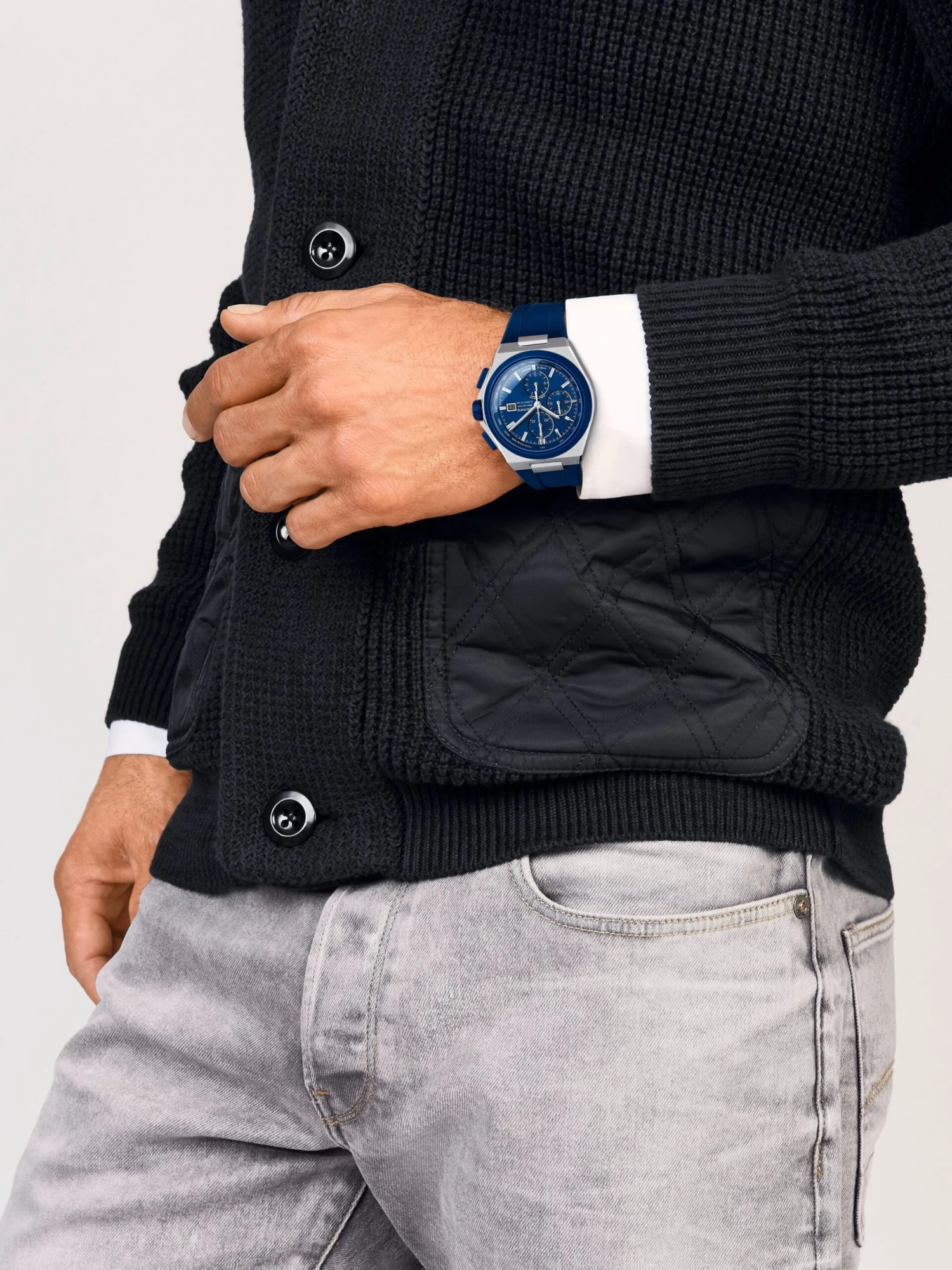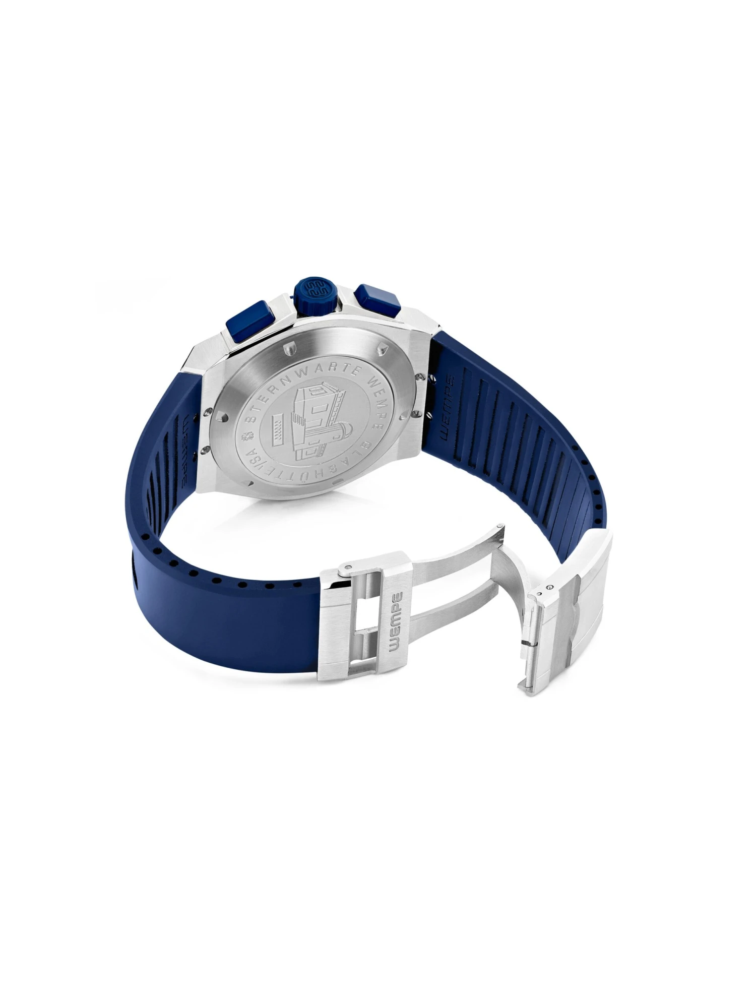 Masculine and functional. With its striking 44-millimeter stainless-steel case, the sporty Iron Walker Automatic Chronograph XL Ref. WI400002 from Wempe Glashütte I/SA offers more space for a clear dial design. The three totalizers at 6, 9 and 12 o’clock and the date display at 3 o’clock are edged with stainless steel and harmonize perfectly on the Nordic blue dial. The hands and steel hour markers are coated with Super-LumiNova® to ensure that the chronograph can be used in all lighting conditions. An eye-catching element with a practical function is the rubber-coated stainless steel bezel, which acts as a shock absorber to lessen impacts. The two chronograph buttons are located directly next to the side protectors of the screw-in crown and are also coated with rubber. Thanks to the screw-down caseback, the timepiece is water-resistant to 10 bar. It is powered by a high-precision Swiss self-winding chronograph caliber, which is certified as a chronometer in accordance with the strict German standard ISO 3159. The sporty all-rounder is worn on a durable rubber strap that matches the color of the dial.