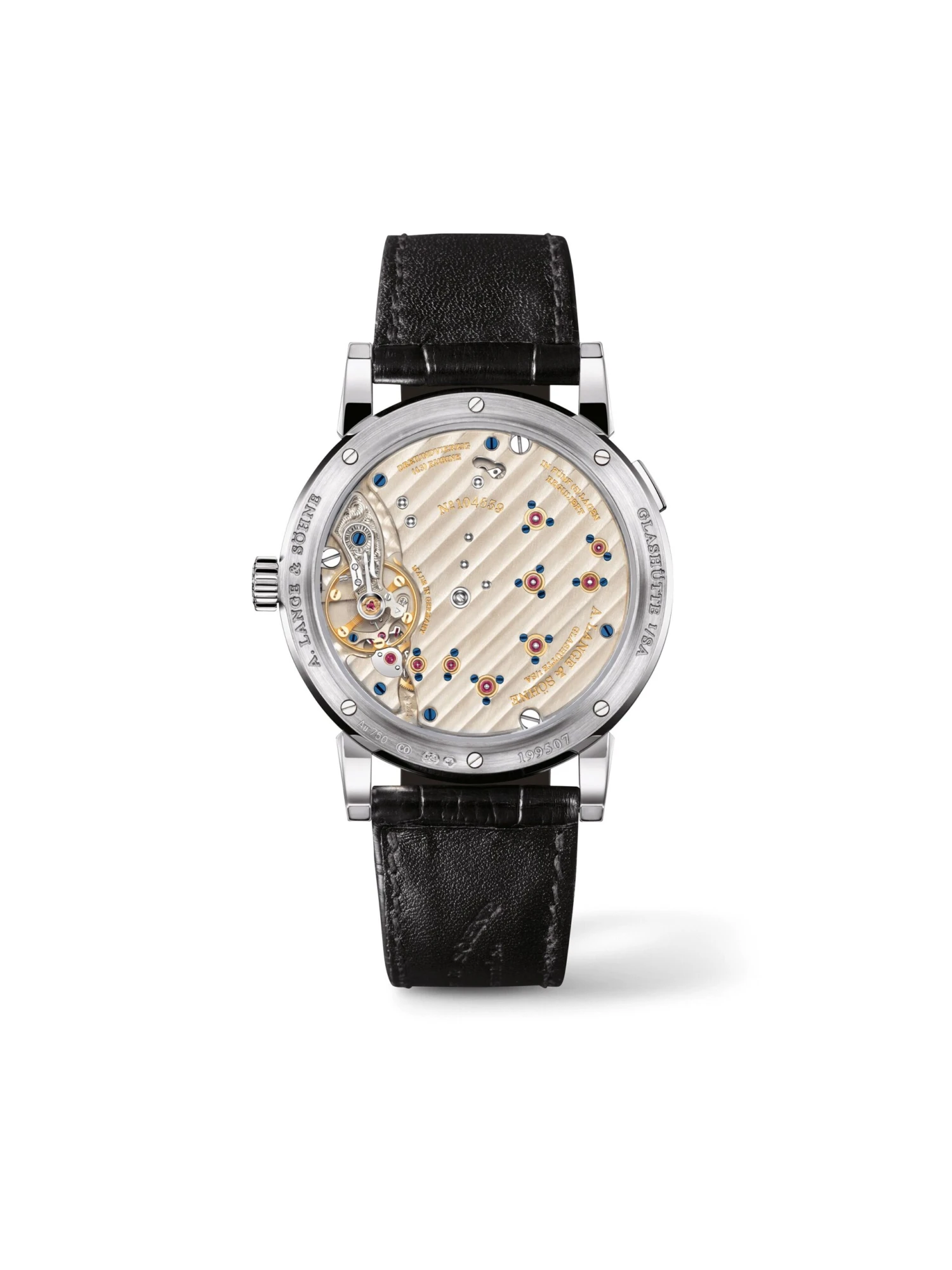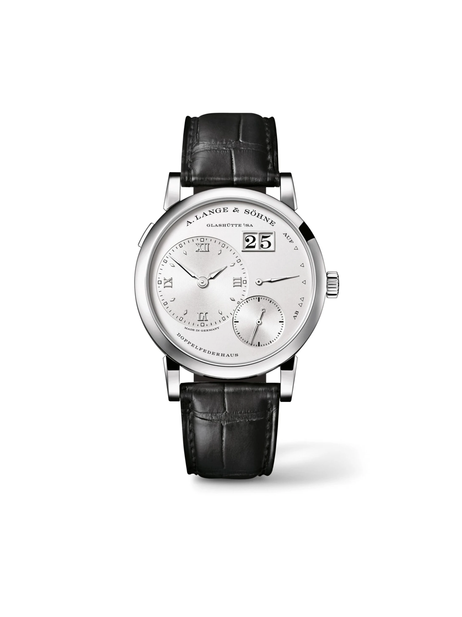 The Grand Lange 1 is a true classic from the house of A. Lange & Söhne. The case in 18k rose gold has a diameter of 38.5 millimeters, yet is only 8.8 millimeters high. It houses a hand-wound movement in which an escapement regulates the rate, the balance spring of which is manufactured in-house. The characteristic, decentralized displays on the silver dial do not overlap. The dimensions of the large date are larger here than in any other watch in the house. Even in the dark, the watch is easy to read thanks to its noctilucent hands.