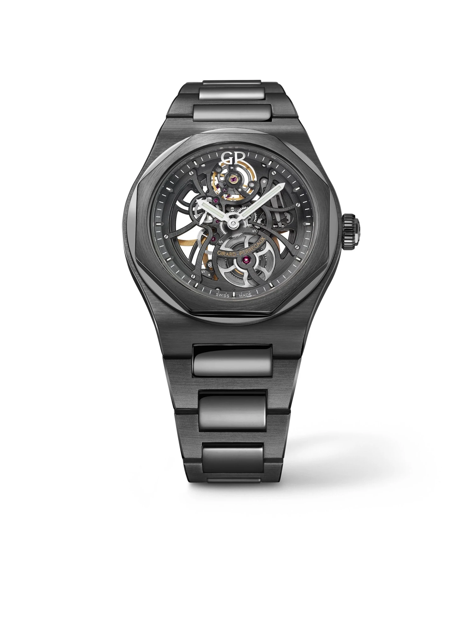Skeleton watches represent great art in miniature: Since the intrinsically filigree movement parts are broken down to their supporting basic substance, they allow fascinating insights into their micromechanical cosmos. The Laureato Skeleton Ref. 81015-32-001-32A, whose manufacture caliber GP01800-0006 is free of all redundant material, also possesses exquisite charm down to the most minute detail. For example, the four-heart oscillating balance of the automatic caliber, which has a power reserve of 54 hours, appears at 12 o’clock. This masterpiece is housed in a 42 millimeter, 10.88 millimeter high ceramic case that is water-resistant to ten bar.