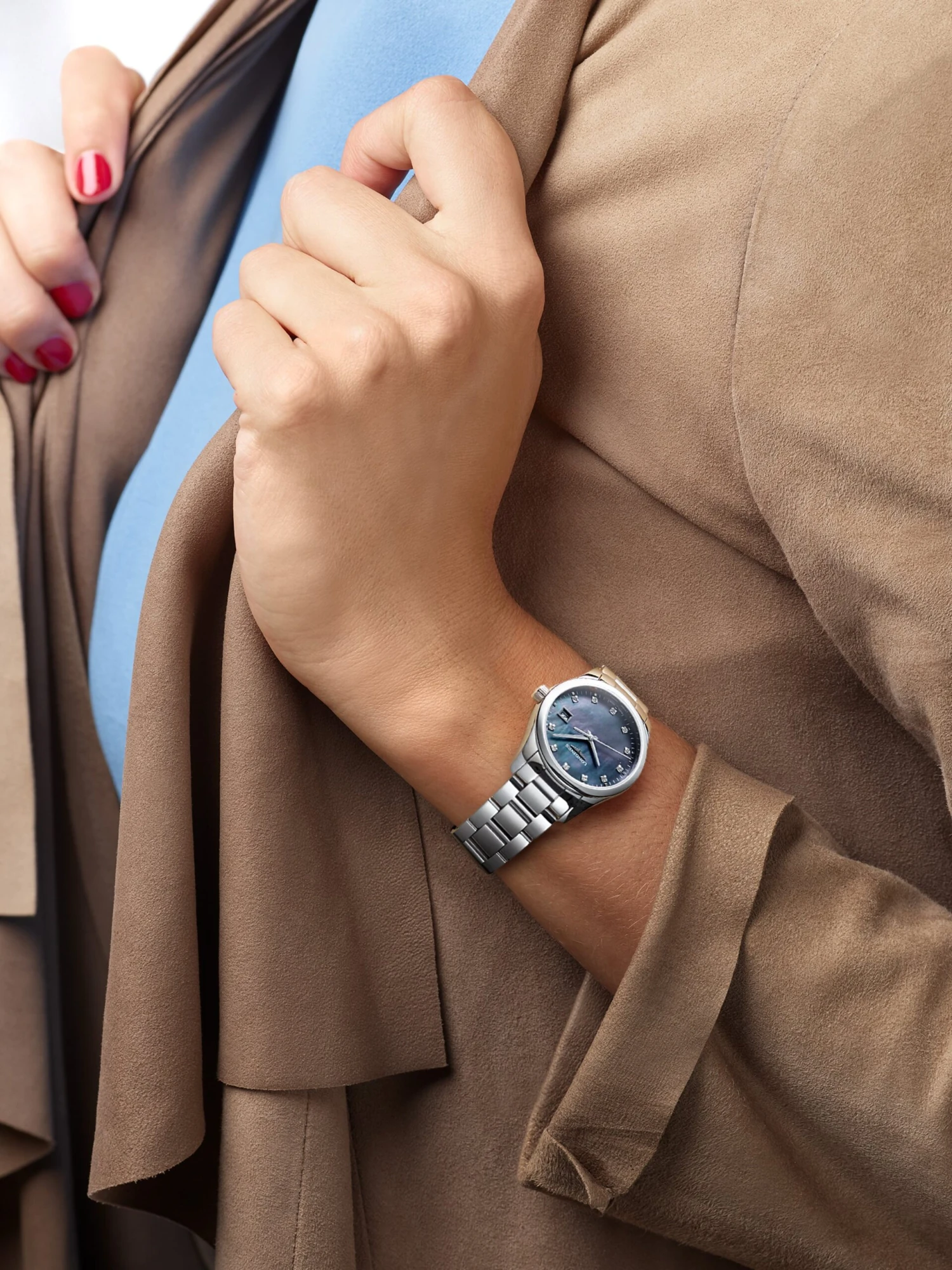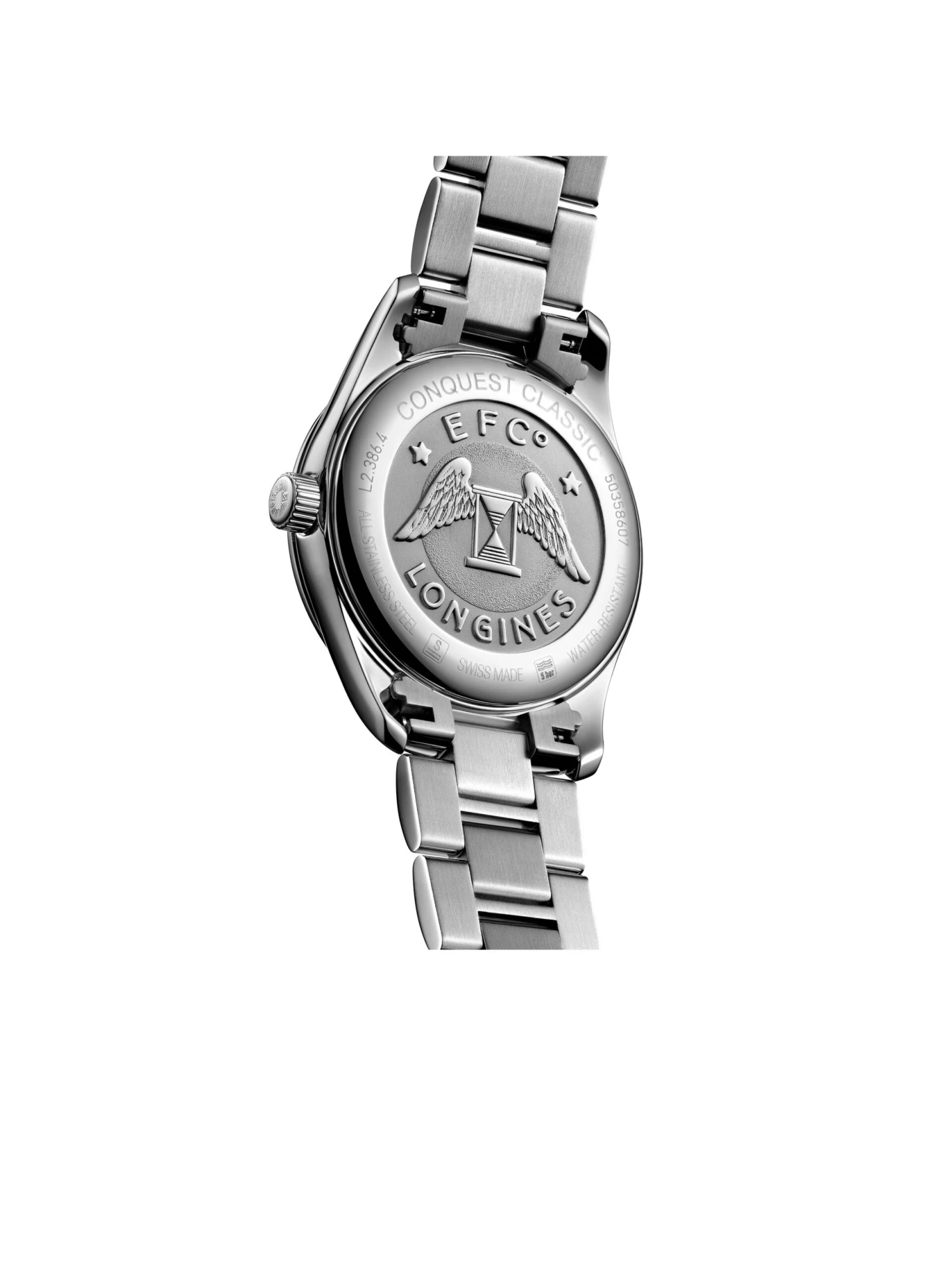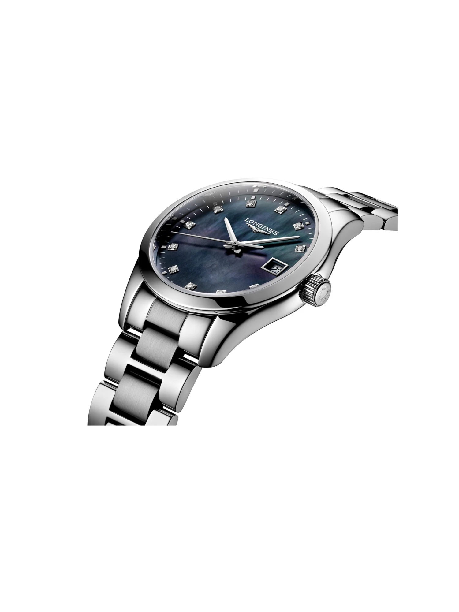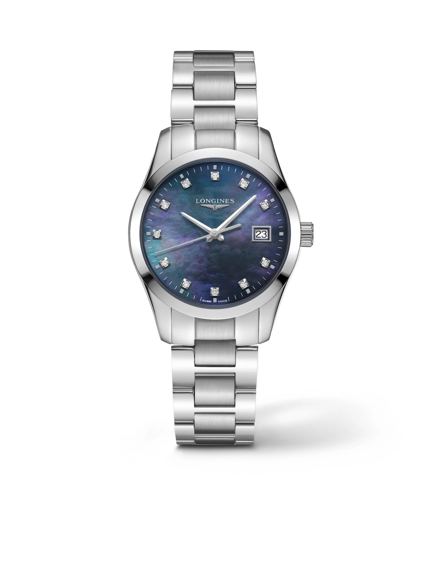 Longines proves with the Conquest Classic LO130167 that sports watches can also be elegant. Shimmering in different shades of blue, the black mother-of-pearl dial is an absolute eye-catcher. Eleven sparkling diamonds with a total carat weight of 0.055 ct emphasize the extravagance of this quartz watch with a stainless-steel case of 34 millimeters in diameter. The three-row stainless-steel bracelet provides a sporty touch.