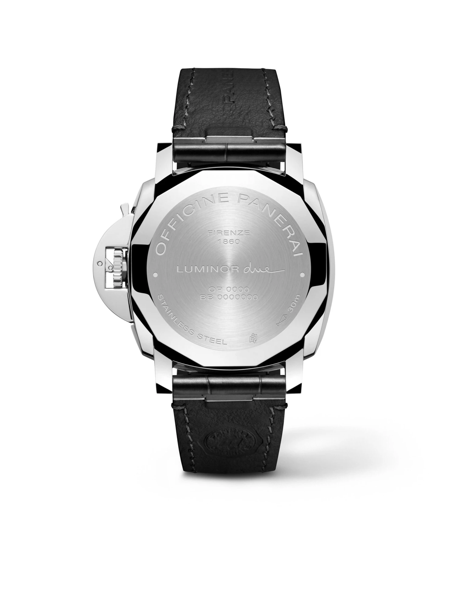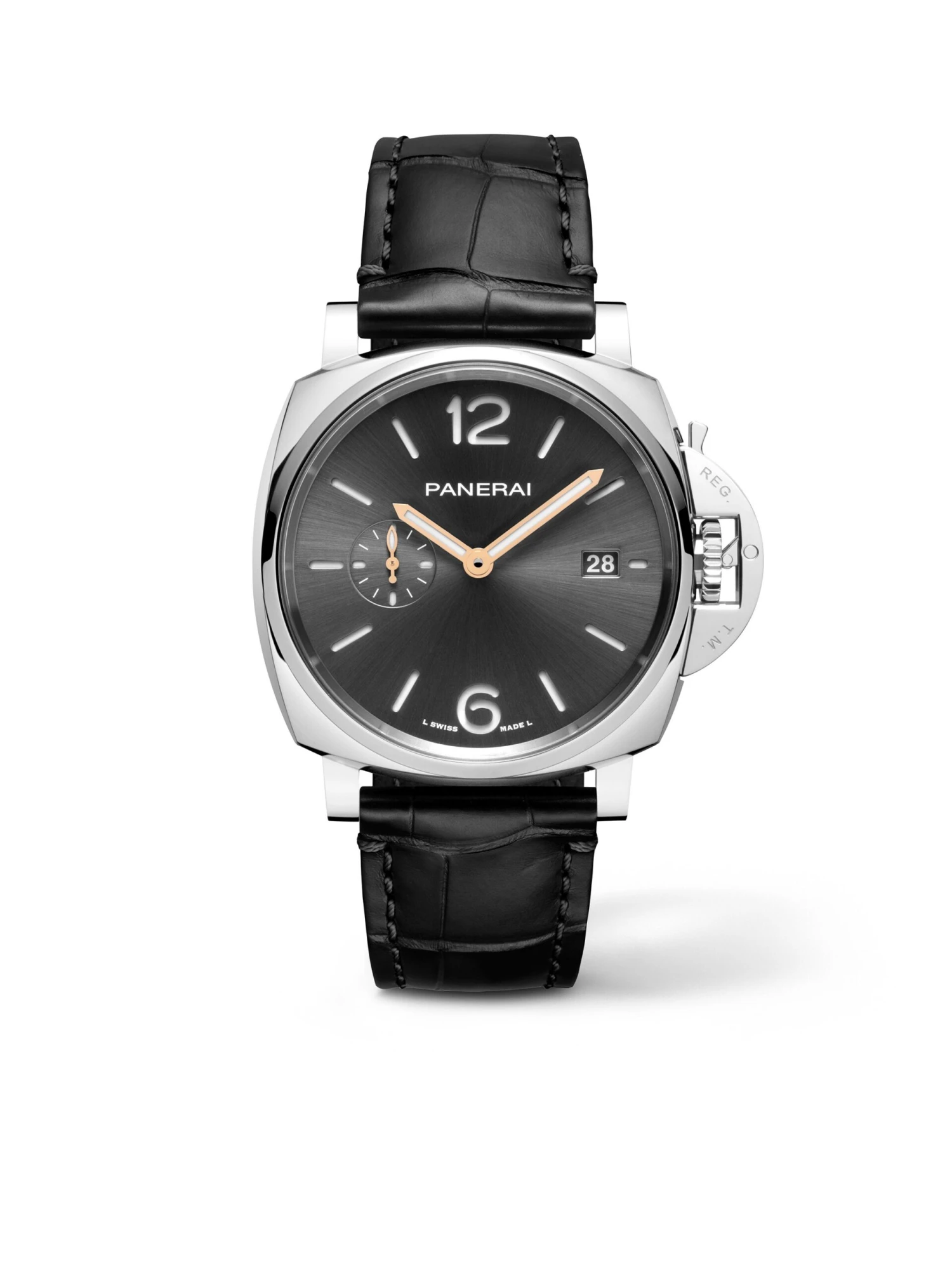 A classic Panerai Luminor Due with a timeless combination of colors and materials. The anthracite dial with sunray decoration harmonizes perfectly with the golden hands and sleek numerals and hour markers. The cushion-shaped stainless steel case forms a visual contrast. The overall look is rounded off by a black alligator-skin strap. The watch features a date display at 3 o’clock and a small seconds subdial at 9 o’clock.