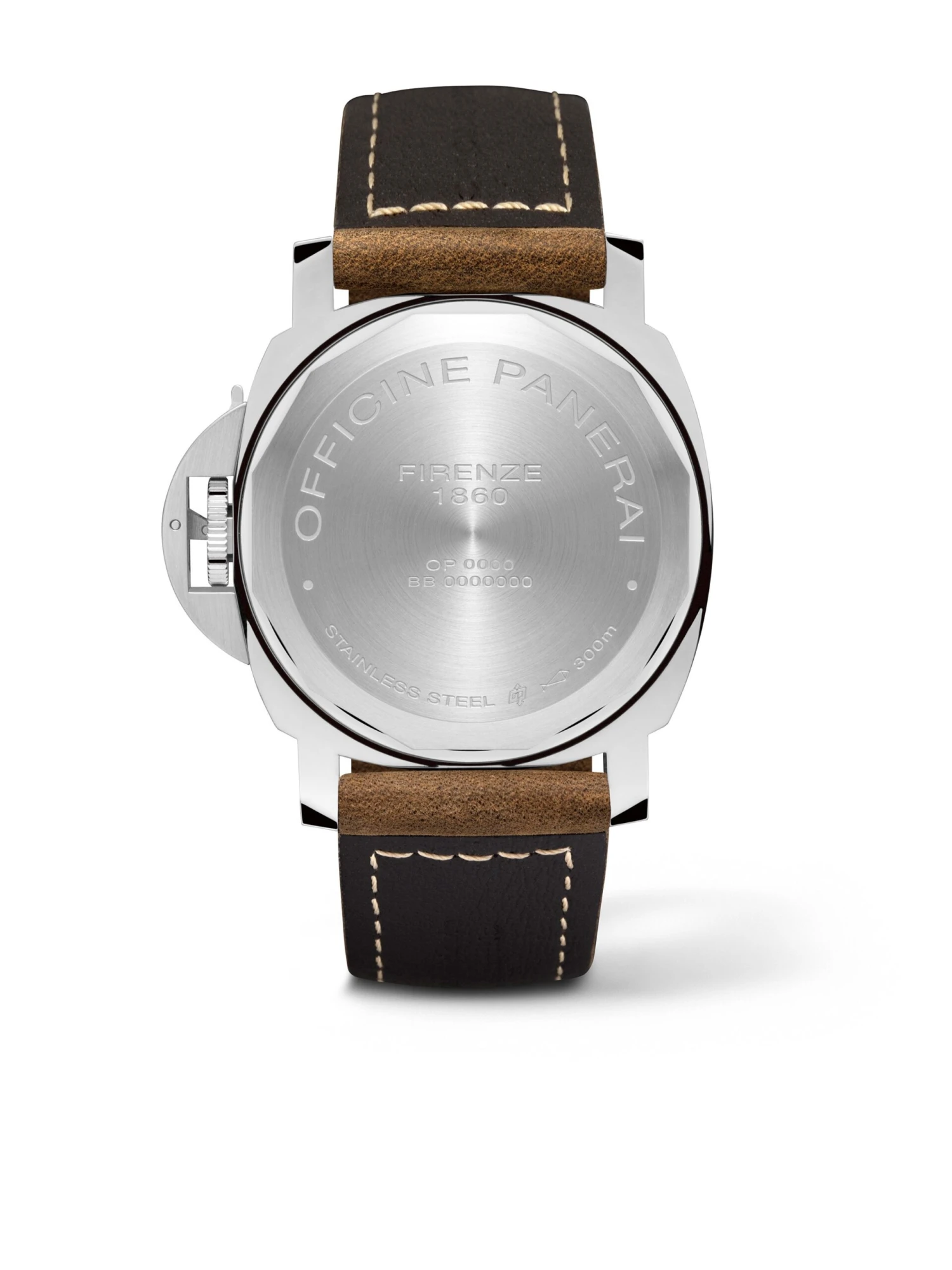 With its cushion-shaped case, the Luminor Base – 44 mm Ref. PAM00914 is a Panerai par excellence. A small detail on the deep black dial, from which the Arabic numerals and fluorescent hour markers stand out, gives a hint of the special nature of this watch: 8 GIORNI stands for the incredible power reserve of 8 days. Inside the 44-millimeter Luminor case made of stainless steel with the characteristic crown-protection bridge and water-resistant to 30 bar, there is hand-wound manufacture caliber P.5000. The watch is fitted on a dark brown suede leather strap with beige stitching.