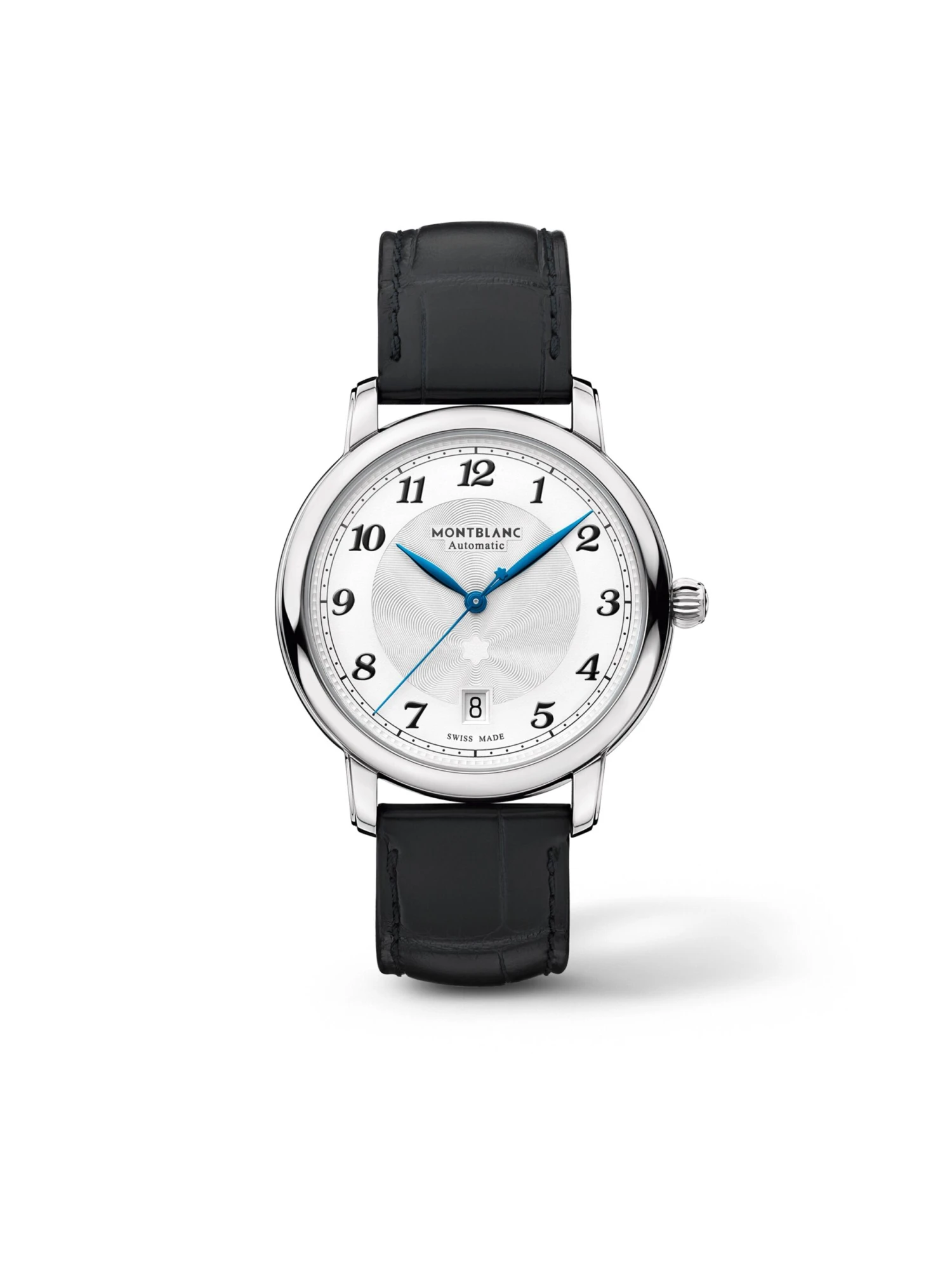 A textbook three-hand watch: The Montblanc Star Legacy Automatic Date 39 mm Ref. 116522 brings subtle elegance to the wearer’s wrist Blued leaf hands circle over the expressive guillochĂ© pattern that traces the shape of the Montblanc star and bears the characteristic Breguet-style Arabic numerals. Fine Swiss understatement is also symbolized by the automatic caliber MB 24.01, which beats in the 39.0 x 9.8 millimeter stainless steel case.