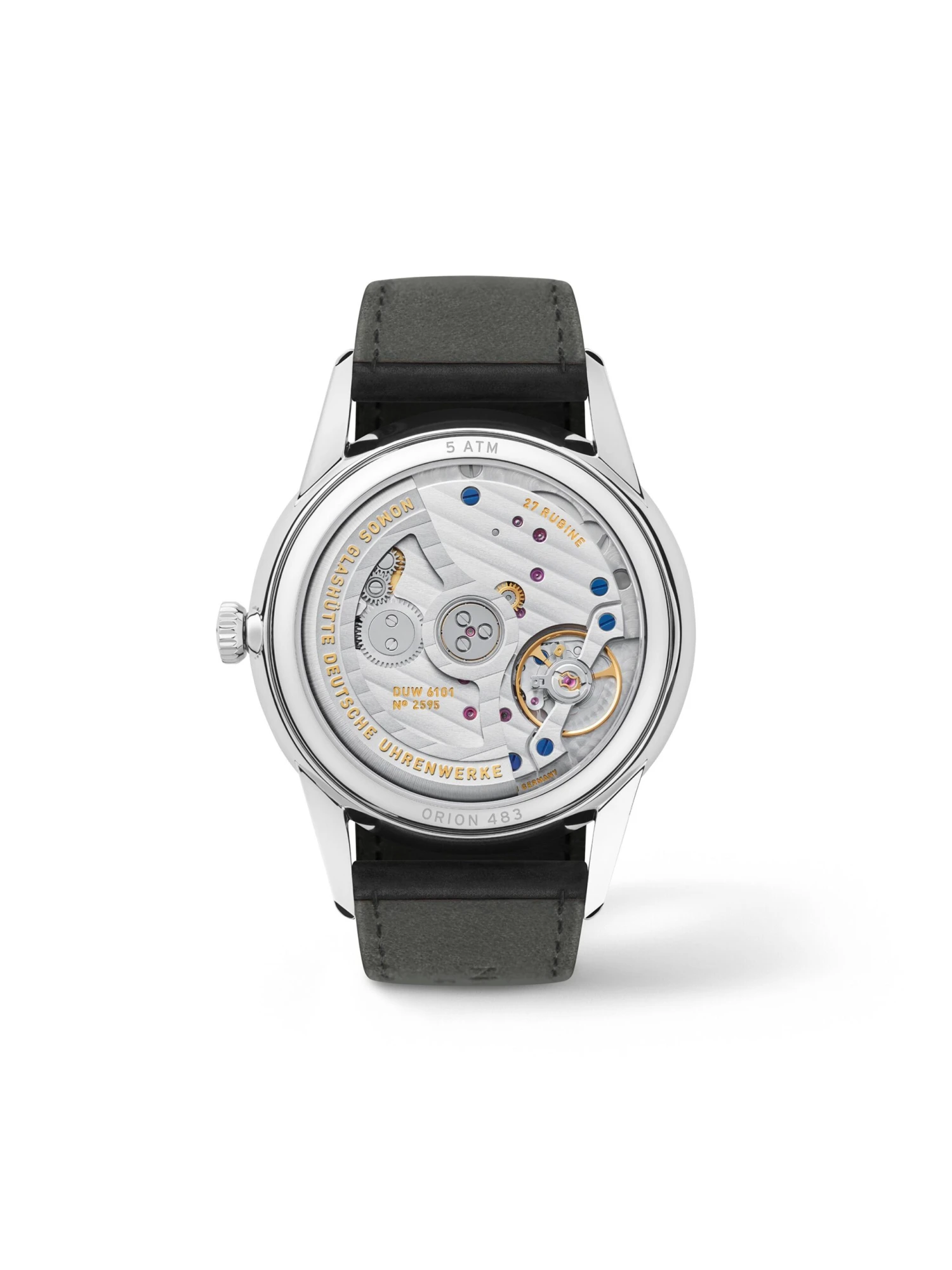 The Orion model is a prime example of minimalism thanks to its dial featuring solely hour markers. Thread-like hands that are just as simple circulate above it. The stainless-steel caresses the wrist with its gentle curvature and well-proportioned shape. The Orion Neomatik 41 Date, reference 363, ticks to the rhythm of the hand-wound DUW 6101 caliber with a date at three o’clock. The date ring is laid around the movement, leaving the 40.5 millimeter wide stainless-steel case extremely thin at 9.4 millimeters. The Orion Neomatik 41 Date, reference 363, sports a sapphire-crystal case back and a leather strap made of Horween Genuine Shell Cordovan.
