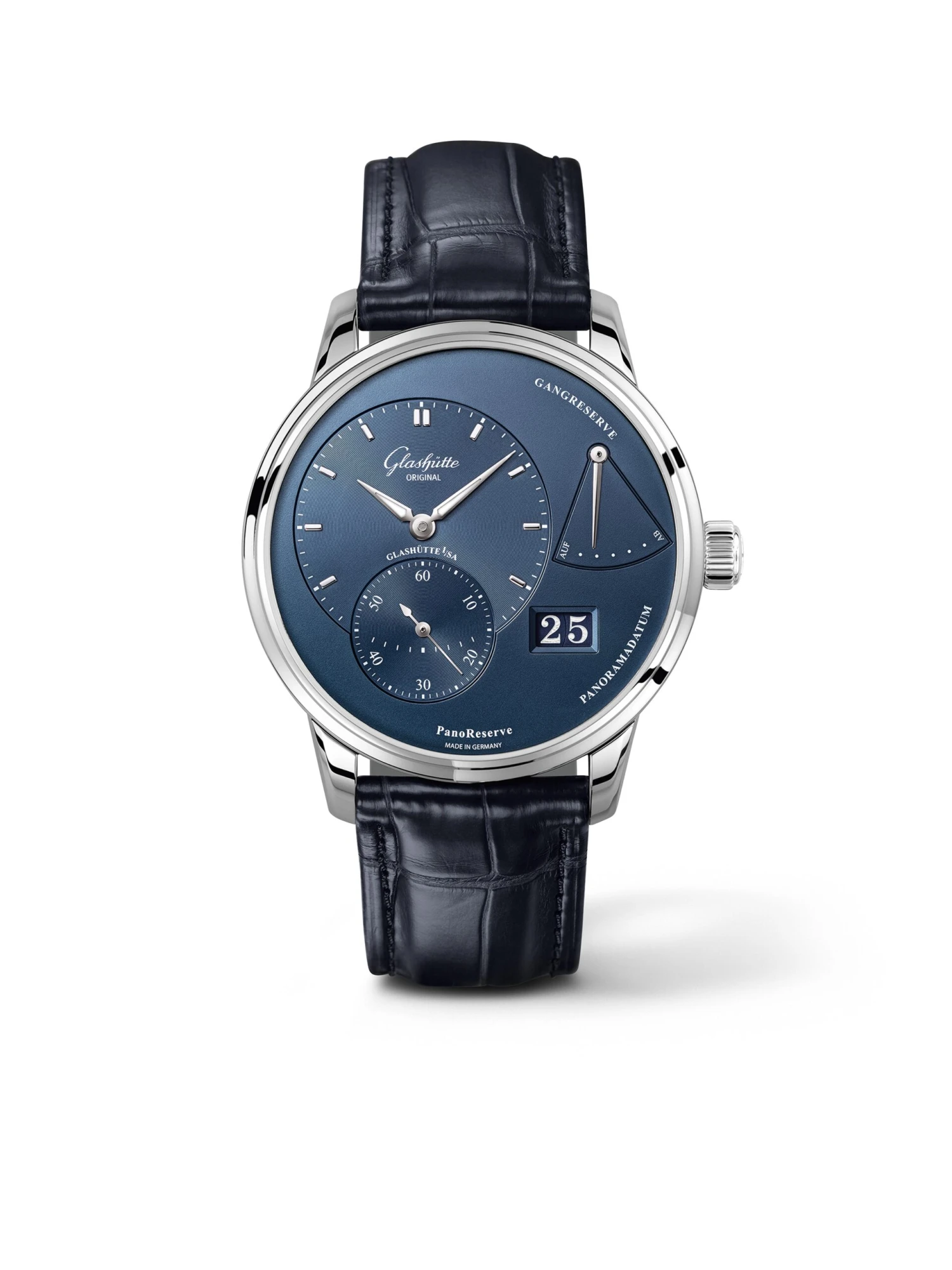 The stylish, asymmetrical dial design of the Pano line is complemented on the PanoReserve (Ref. 1-65-01-26-12-61) by a 42-hour power-reserve display. Other functions such as the off-center hour and minute, small seconds and the typical panorama date display appear in high contrast on the galvanized blue dial with fine matte finish. The stainless-steel case with a diameter of 40 millimeters and an overall height of 11,7 millimeters comes with a sapphire crystal caseback, providing an unimpeded view of hand-wound caliber 65-01 with a three-quarters plate, screwed gold chatons, duplex swan-neck fine adjustment as well as a hand-engraved balance bridge. A blue Louisiana alligator-skin strap harmoniously rounds off the appearance of this elegant timepiece.