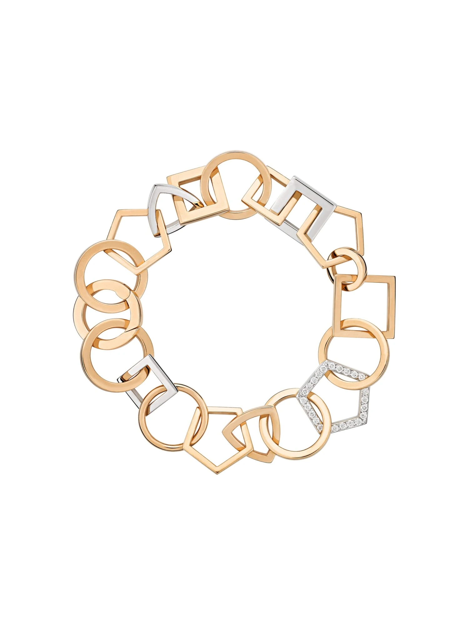A confident mix of shapes and colors. The extraordinary Playlist BY KIM bracelet combines angular and round chain links of 18k white and rose gold, with and without diamond studding. A total of 25 brilliant-cut diamonds weighing 0.37 ct ensure radiant points of light. Featuring dynamism and extravagance, this creation is certain to provide variety for your jewelry styling. With Playlist BY KIM, every woman finds her own style. Totally to the beat of her own drum.