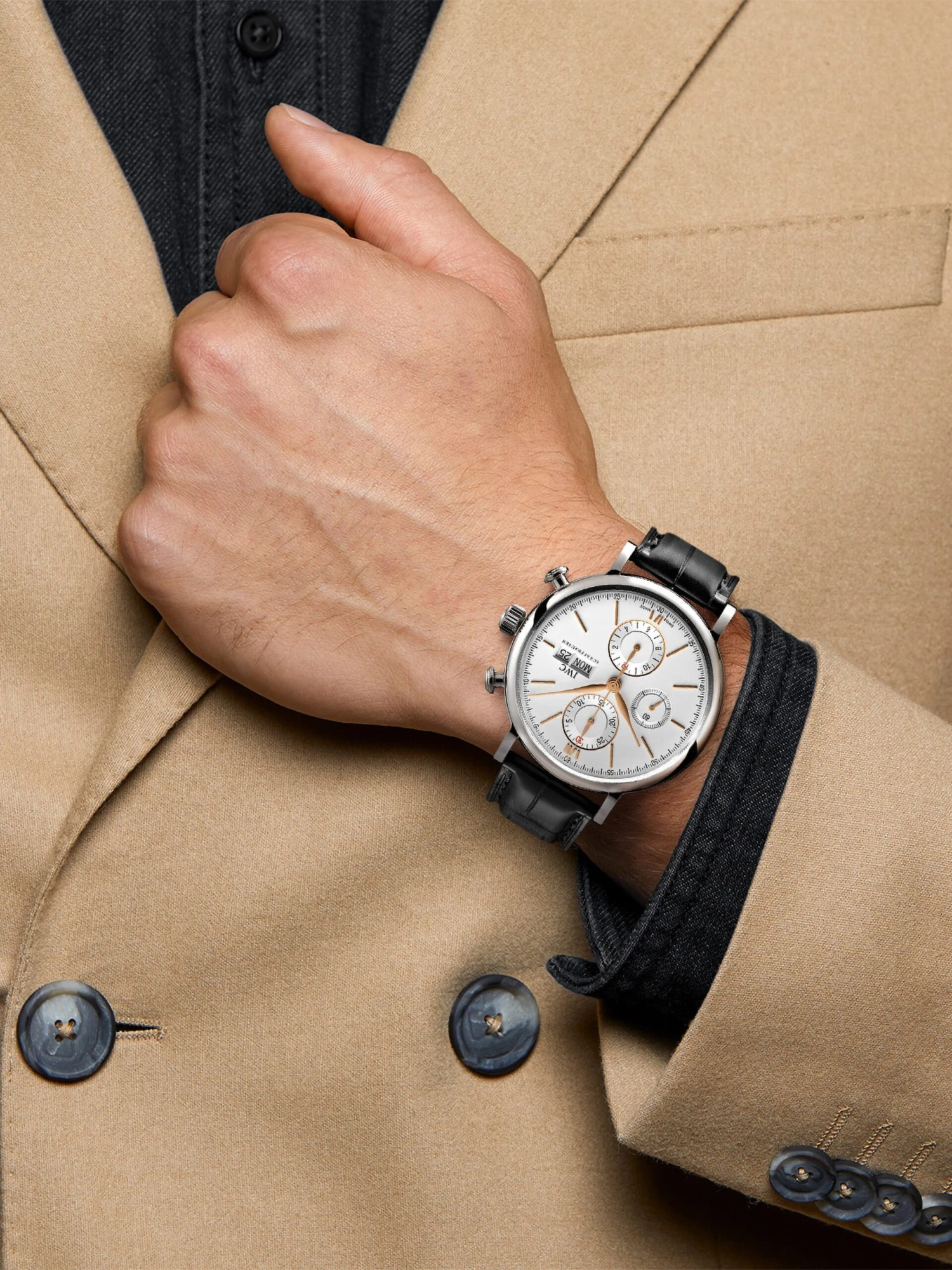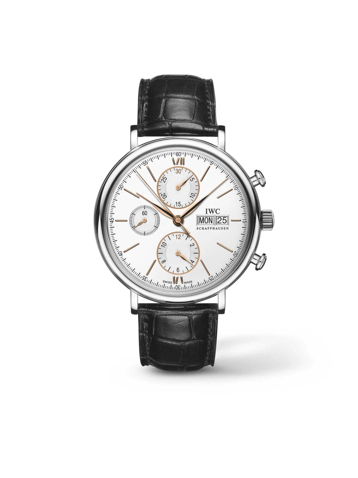 The Portofino Chronograph Ref. IW391031 represents the discreet luxury inherent in the beloved family of watches. Behind the silver-plated dial with rhodium-plated appliqués beats the automatic chronograph caliber 75320 with date and weekday display. The chronograph push-pieces and totalizers reflect the technical style of the 1960s. The 42 millimeter large and 13.6 millimeter high stainless steel case is fitted with a black alligator-skin strap.
