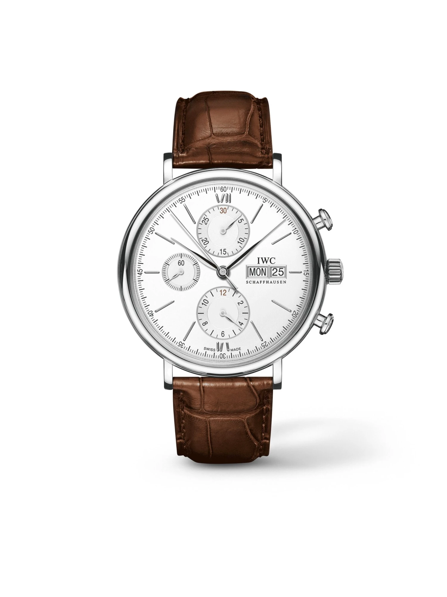 The Portofino Chronograph, reference IW391027, represents the subtle luxury that characterizes this popular family of watches. The silver-plated dial with rhodium-plated appliqués covers a 75320 automatic chronograph caliber with date and day displays. The chronograph push-pieces and totalizers reflect the technical style of the 1960s. The 42-millimeter-wide and 13.6-millimeter-thick stainless steel case is fitted with a dark brown alligator-leather strap.