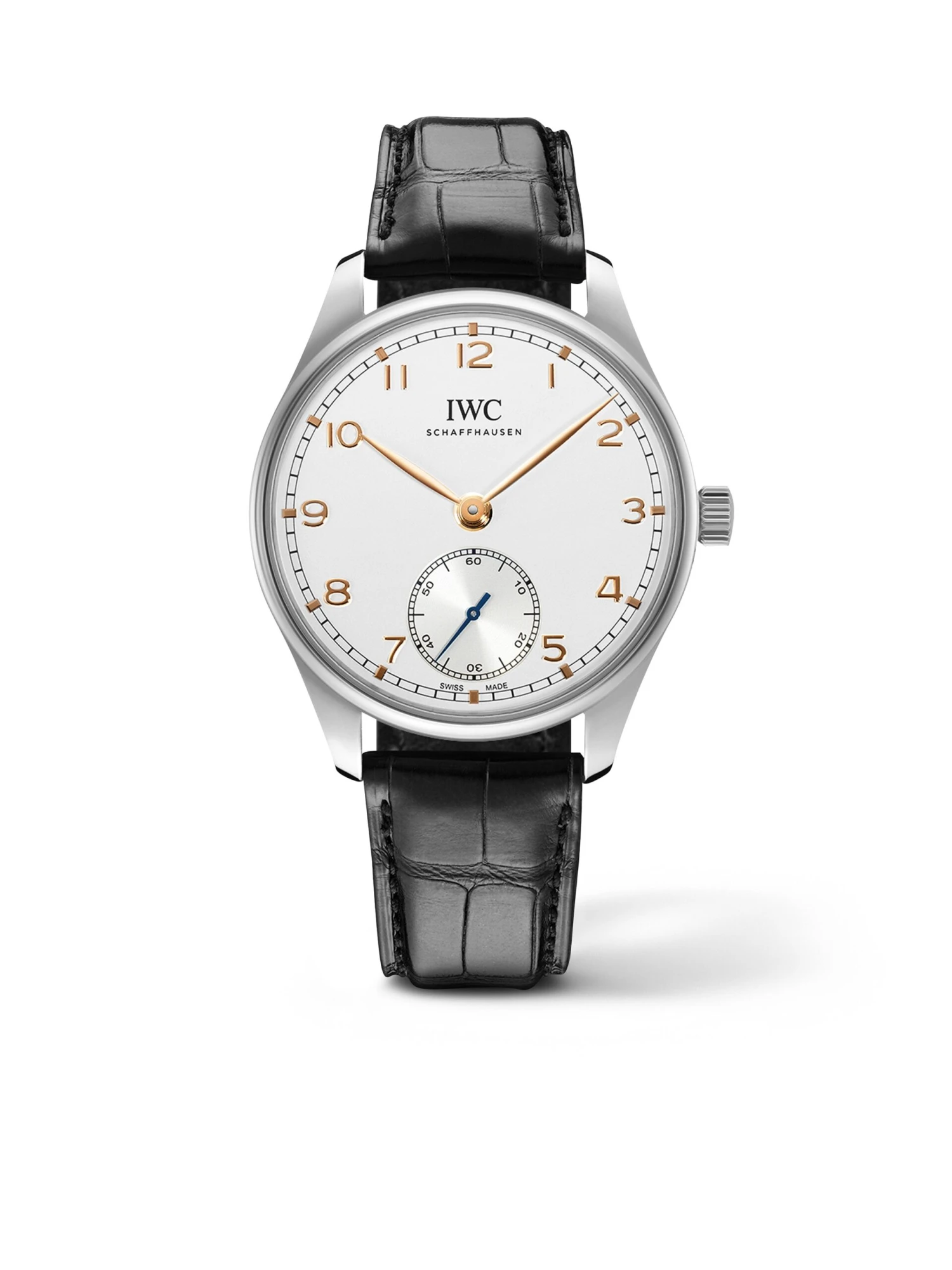 The classic Portugieser Ref. IW358303 with silver-colored dial and golden hands and markers adapts to every wearer and every situation. The seconds are displayed off-center at six o’clock. The automatic manufacture caliber 82200 runs in a 40.4 millimeter stainless steel case. A dresswatch par excellence.