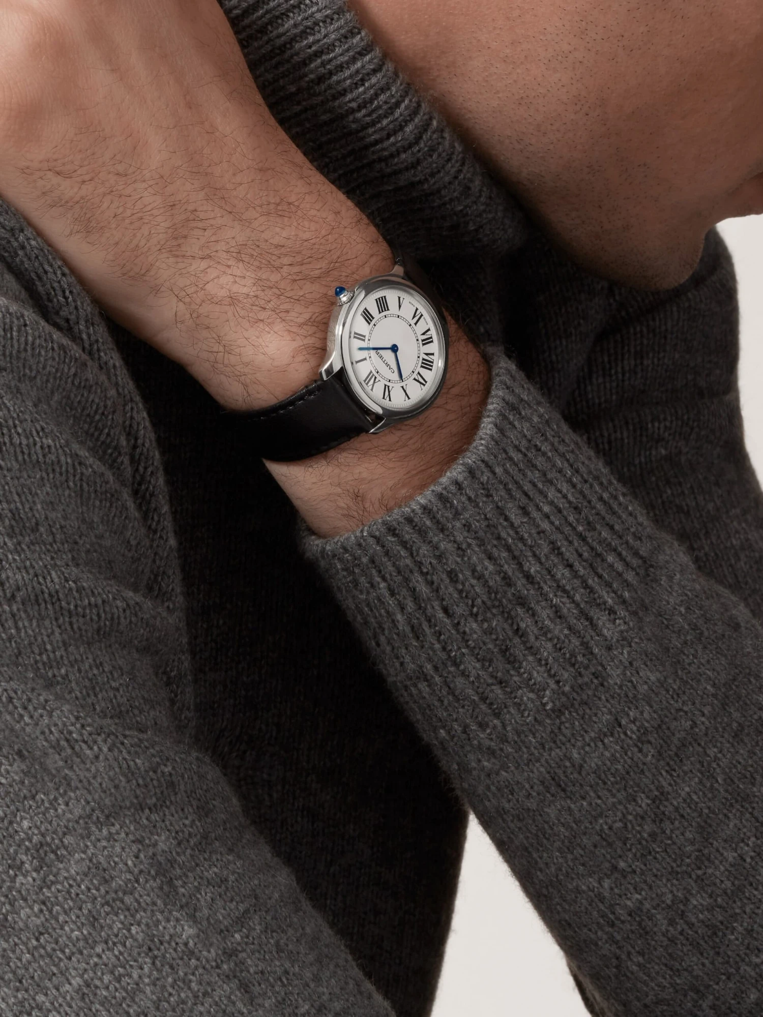 Ronde Must de Cartier watch, 36 mm, high autonomy quartz movement (approx. 8 years). Steel case, beaded crown set with a synthetic cabochon-shaped spinel, sandblasted silvered dial, blued-steel sword-shaped hands, sapphire crystal, black strap (made without animal materials), steel ardillon buckle. Thickness: 7.89 mm. Water-resistant to 3 bar (approx. 30 meters/100 feet).