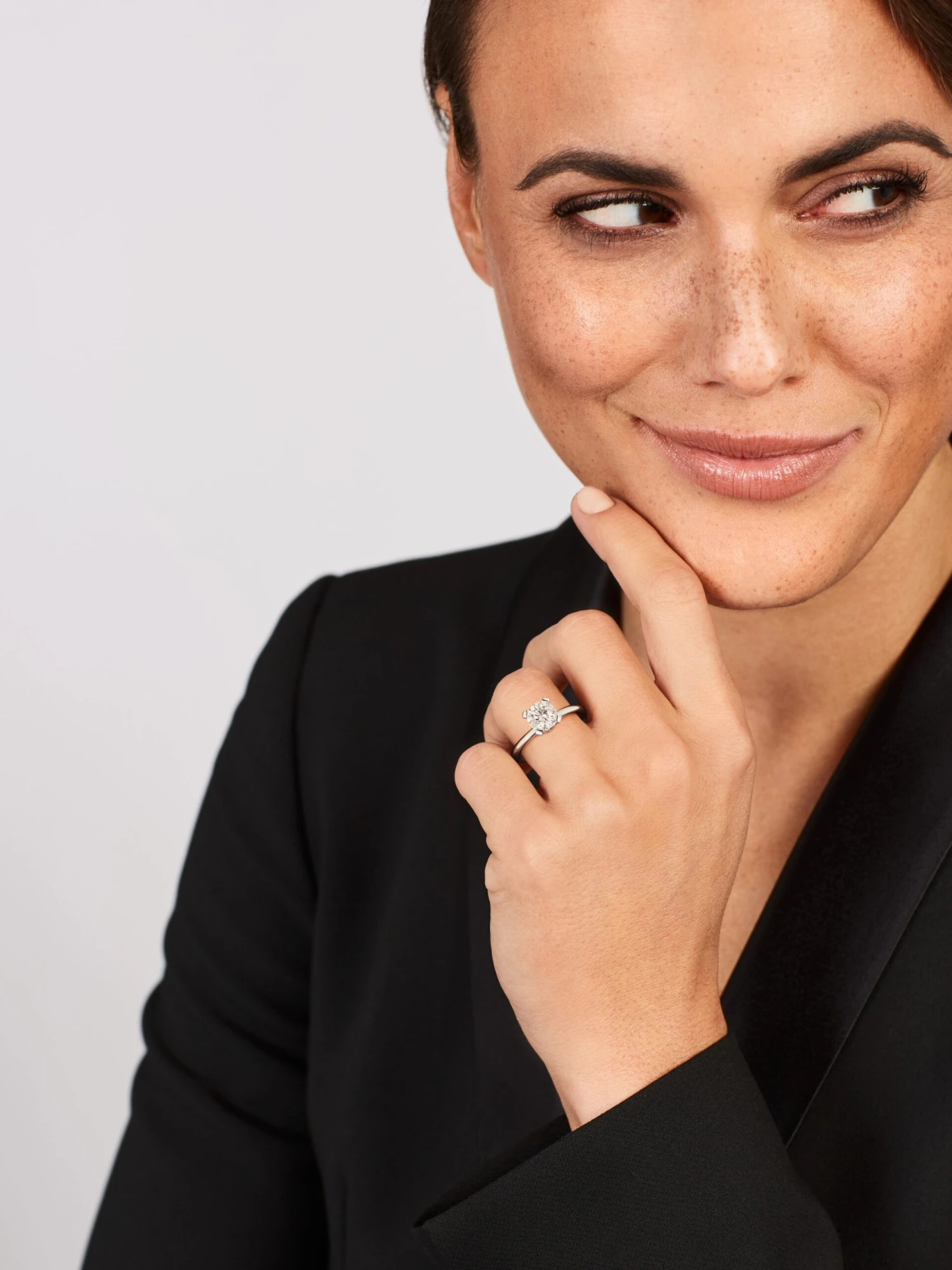 Endless brilliance meets precise, detailed work in our handcrafted Splendora Pure BY KIM ring. A 1.50 ct diamond is held by for distinctive prongs sitting on a sparkling halo of brilliant-cut diamonds weighing 0.12 ct in total. The special feature of this solitaire is its exclusive cut: the WEMPE-Cut® with 137 facets. The result is an 18k white gold ring with a play of light that one can never get enough of.