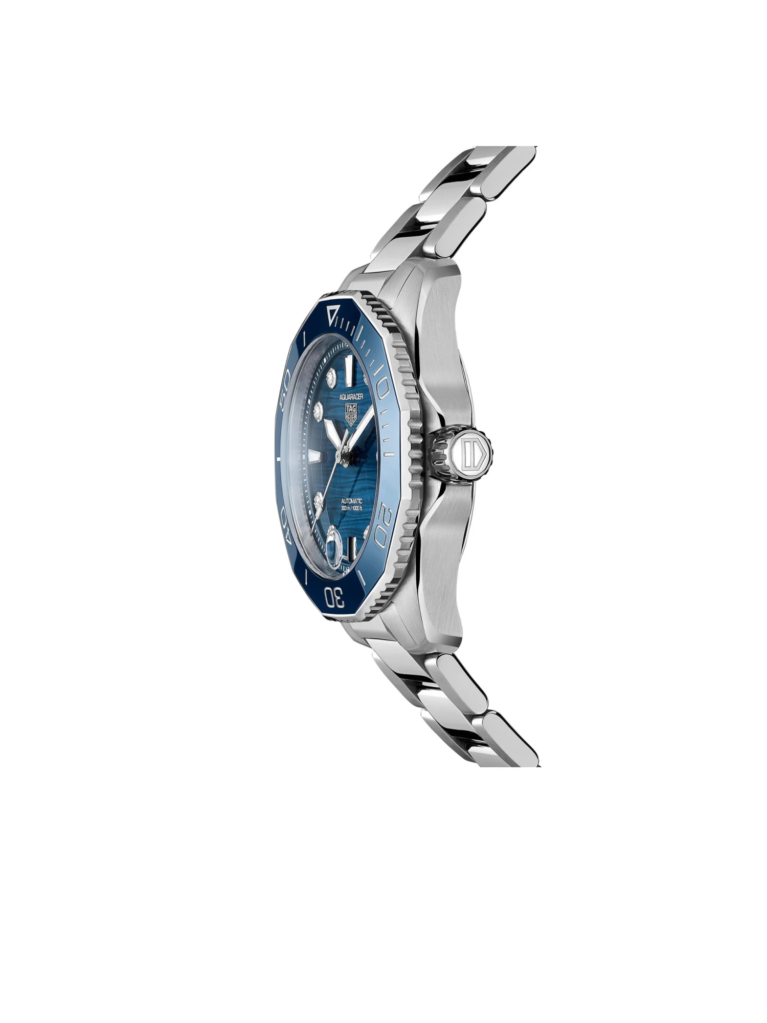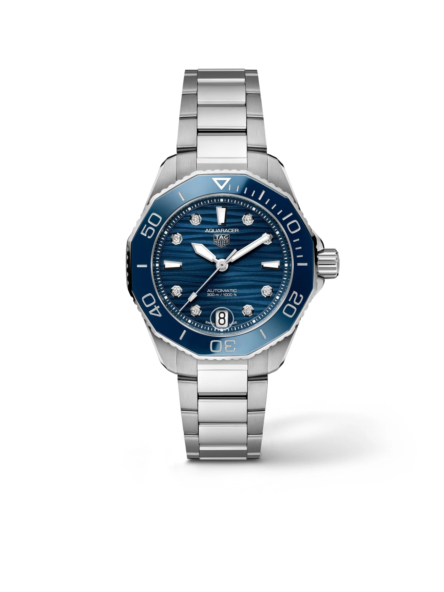 Bold yet elegant, highly functional yet versatile. With the Aquaracer Professional 300 Ref. WBP231B.BA0618, TAG Heuer continues the 40-year success story of its distinctive diving watch. The 36-millimeter stainless-steel case with a unidirectional rotating bezel in the characteristic dodecagonal shape and made of blue ceramic is water-resistant up to 30 bar. The ocean blue dial has a horizontal stripe decoration and a date display at 6 o’clock. All hands and hour markers are coated with Super-LumiNova®. The precise mechanical diving companion is powered by self-winding Calibre 5. Eight elegant diamonds (vs, 0.078 ct) provide additional elegance.