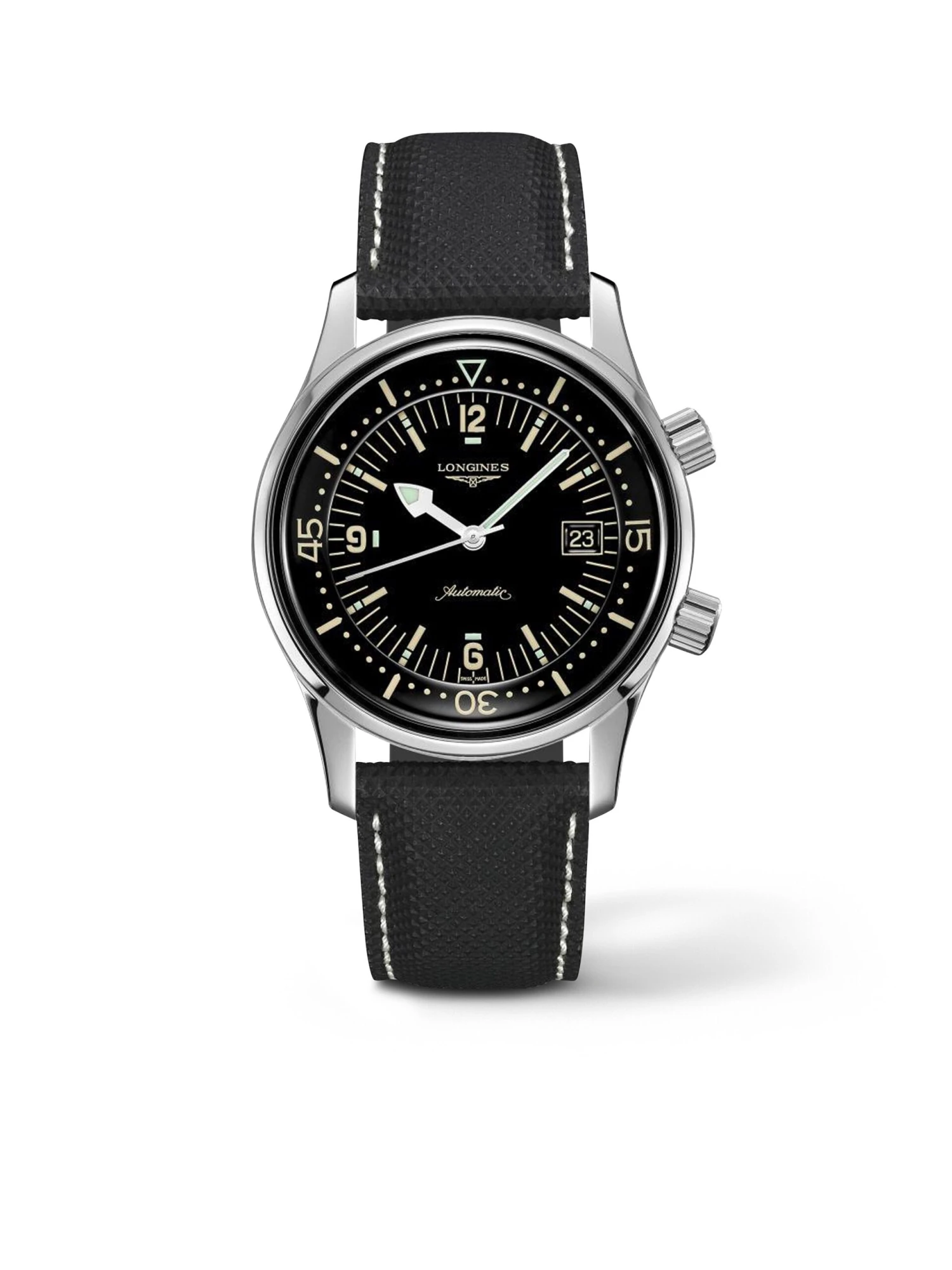 Once one of the first diver’s watches from Longines, the relaunched Legend Diver Watch with a stainless steel case is an elegant tribute to scuba diving and a highlight of the Hertitage collection. The cool sheen of the case is complemented by a black lacquered dial and a black leather strap. Pierced hour markers, Arabic numerals, and hands coated with luminous mass ensure best-possible readability.